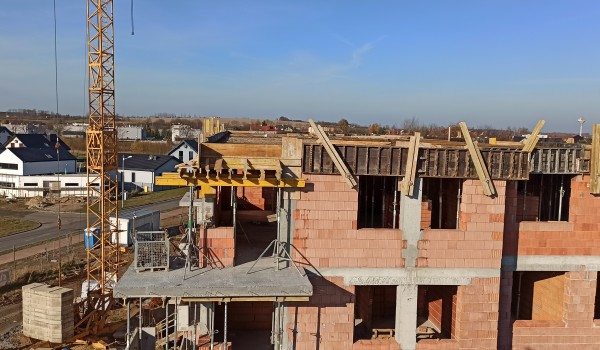 Rozpoczynają się prace przy więźbie dachowej oraz przy montażu stolarki okiennej, trwają prace przy ściankach działowych oraz kominach, jak również przy instalacjach wewnętrznych.