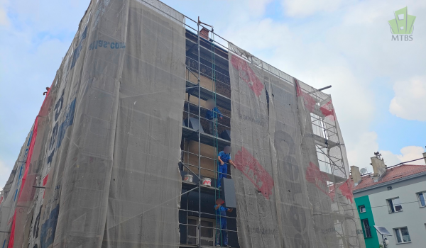 Międzygminne TBS Sp. z o.o. informuje, iż rozpoczęto termomodernizację budynku przy ul. Kościuszki 13B-C, obejmującą: ocieplenie ścian, stropu piwnic oraz poddasza, wykonanie izolacji fundamentów, a także montaż anteny zbiorczej.