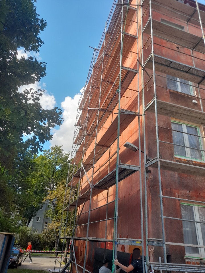 Trwają prace termomodernizacyjne budynku przy ulicy Damrota 42 w Zabrzu, obejmujące: wykonanie instalacji c.o. i podłączenie do sieci miejskiej, ocieplenie budynku, wymianę stolarki okiennej.