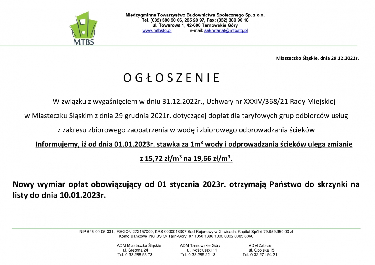 Zmiana stawki za wodę i odprowadzanie ścieków w Miasteczku Śląskim od 01.01.2023r.