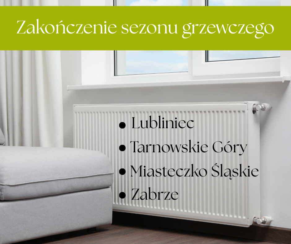 Informujemy, że z dniem 30.05.2025r. został zakończony sezon grzewczy 2024/2025 na terenie: Tarnowskich Gór, Lublińca, Zabrza, Miasteczka Śląskiego, Knurowa oraz Rudy Śląskiej.