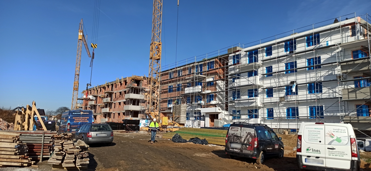 Międzygminne TBS Sp. z o.o. informuje, iż w budynku A wstawiono stolarkę okienną, zakończono wykonywanie ścianek działowych oraz kominów.