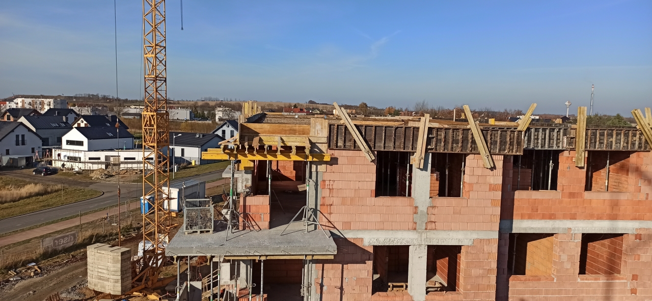 Rozpoczynają się prace przy więźbie dachowej oraz przy montażu stolarki okiennej, trwają prace przy ściankach działowych oraz kominach, jak również przy instalacjach wewnętrznych.