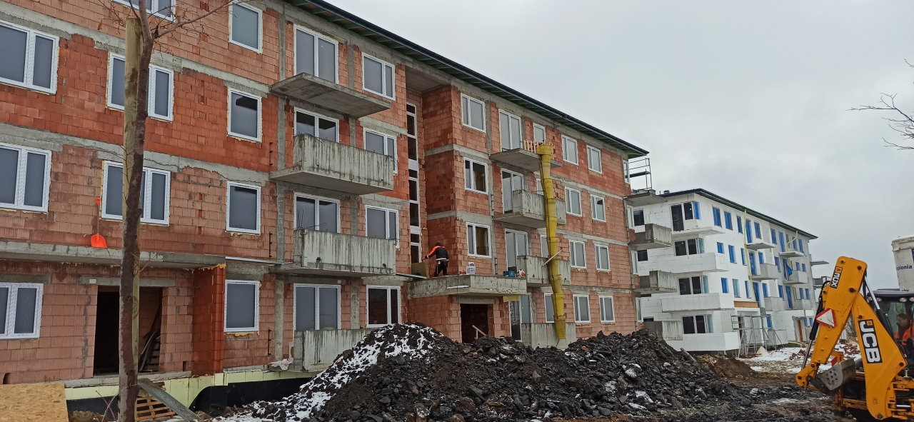Międzygminne TBS Sp. z o.o. informuje, iż w budynku A wykonano dach, trwają roboty tynkarskie oraz prace przy instalacjach: wod-kan, elektrycznych, CO i przygotowania do wykonywania wylewek.