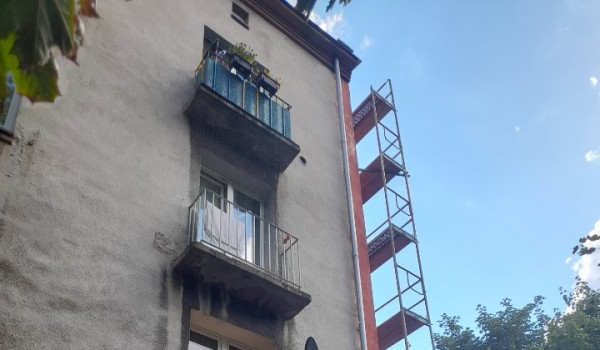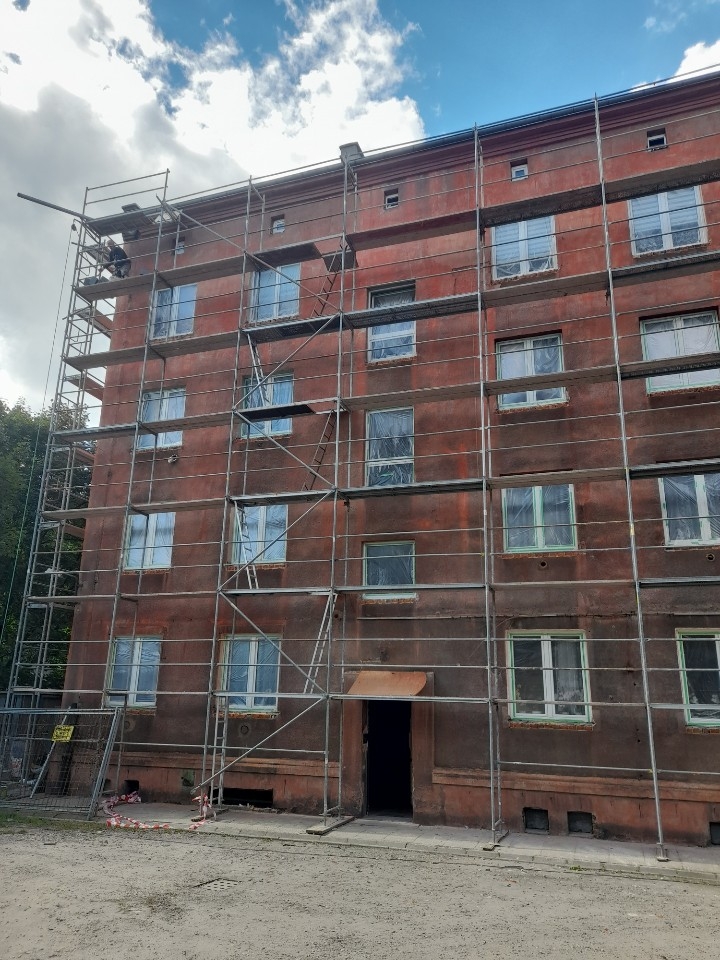 Trwają prace termomodernizacyjne budynku przy ulicy Damrota 42 w Zabrzu, obejmujące: wykonanie instalacji c.o. i podłączenie do sieci miejskiej, ocieplenie budynku, wymianę stolarki okiennej.