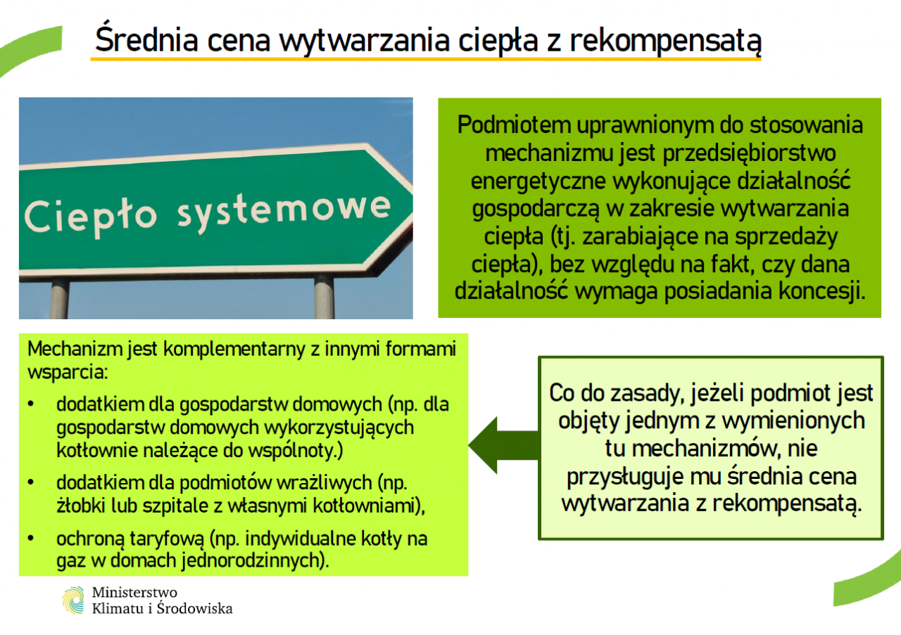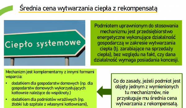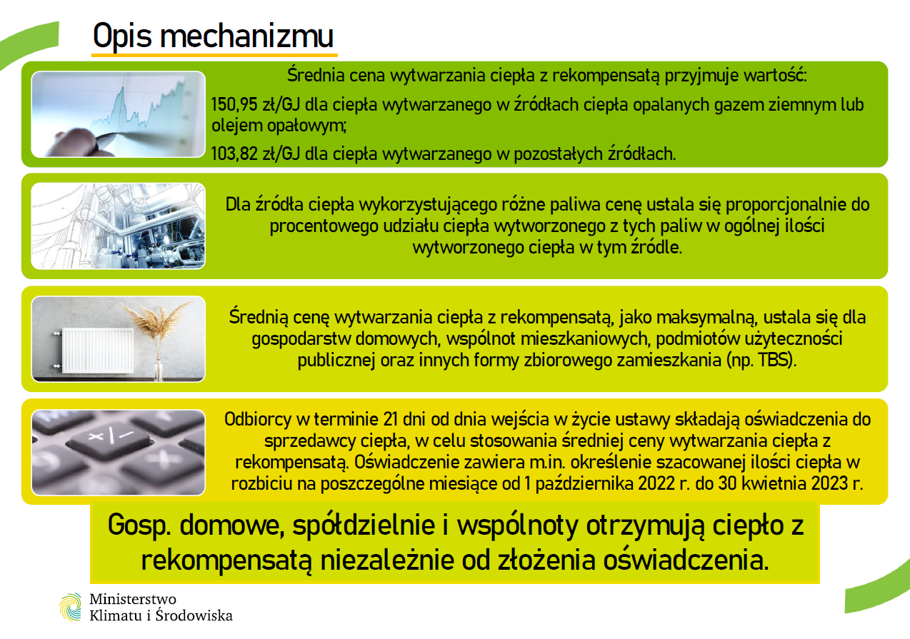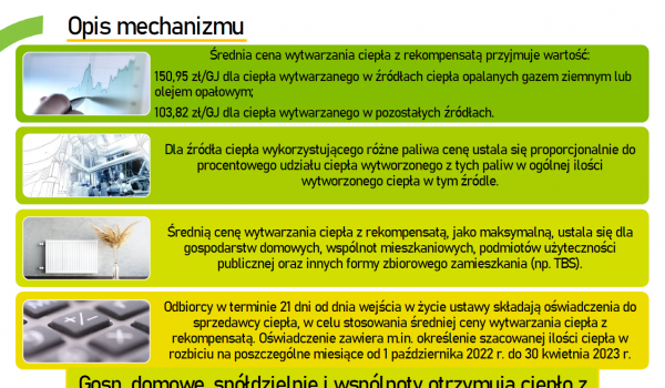 Średnia cena wytwarzania ciepła z rekompensatą przyjmuje wartość netto: 150,95 zł/GJ dla ciepła wytwarzanego w źródłach ciepła opalanych gazem ziemnym lub olejem opałowym oraz 103,82 zł/GJ dla ciepła wytwarzanego w pozostałych źródłach. Rekompensaty obowiązują w okresie od 1 października 2022r. do 30 kwietnia 2023r.