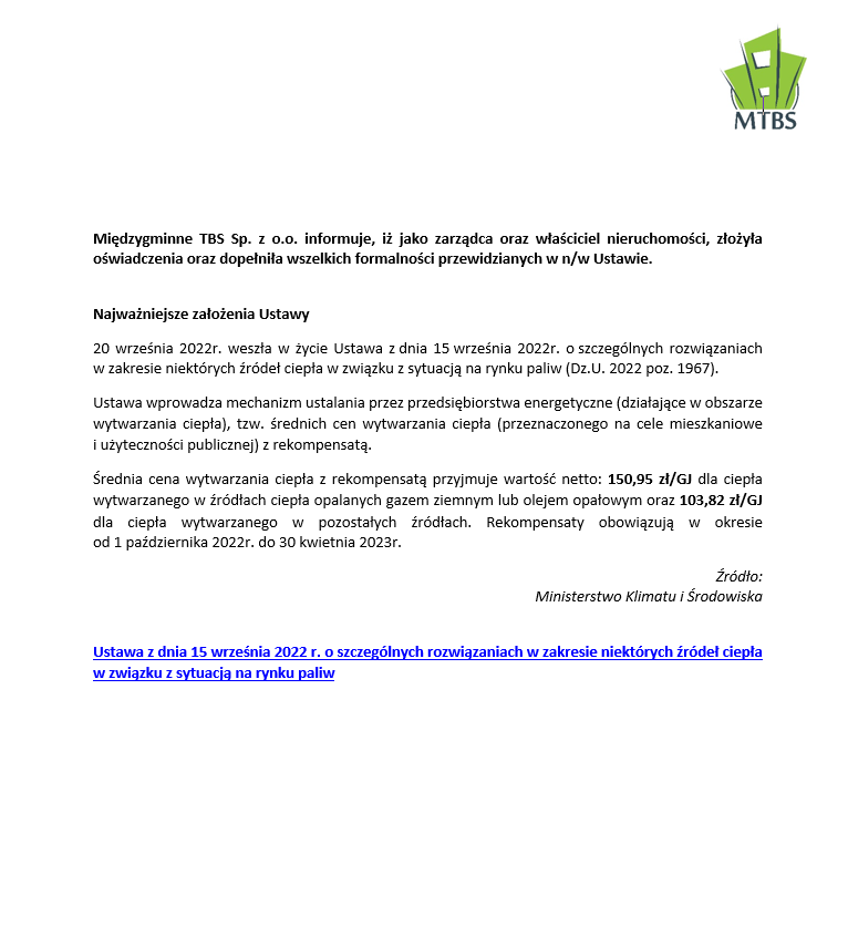 Międzygminne TBS Sp. z o.o. informuje, iż jako zarządca oraz właściciel nieruchomości, złożyła oświadczenia oraz dopełniła wszelkich formalności przewidzianych w n/w Ustawie.